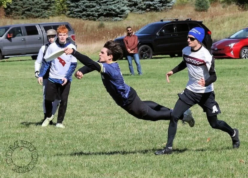 Michael Dagher-Margosian looks on as Bradley Kerr lays out to deny the disc to the offense.